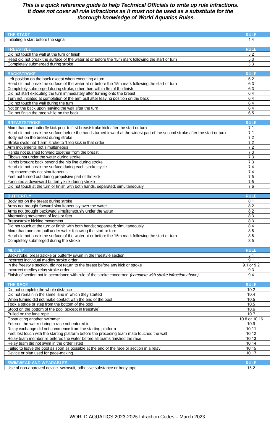 For swimming events, if a swimmer makes a technical mistake and an official identifies this mistake, this is know as a technical infraction. There are many technical infractions and the below information identifies what type of infraction it was. Typically, these are extremely difficult to dispute as the officials are next to the swimmer, whereas spectators are much further away and can't see the infraction.