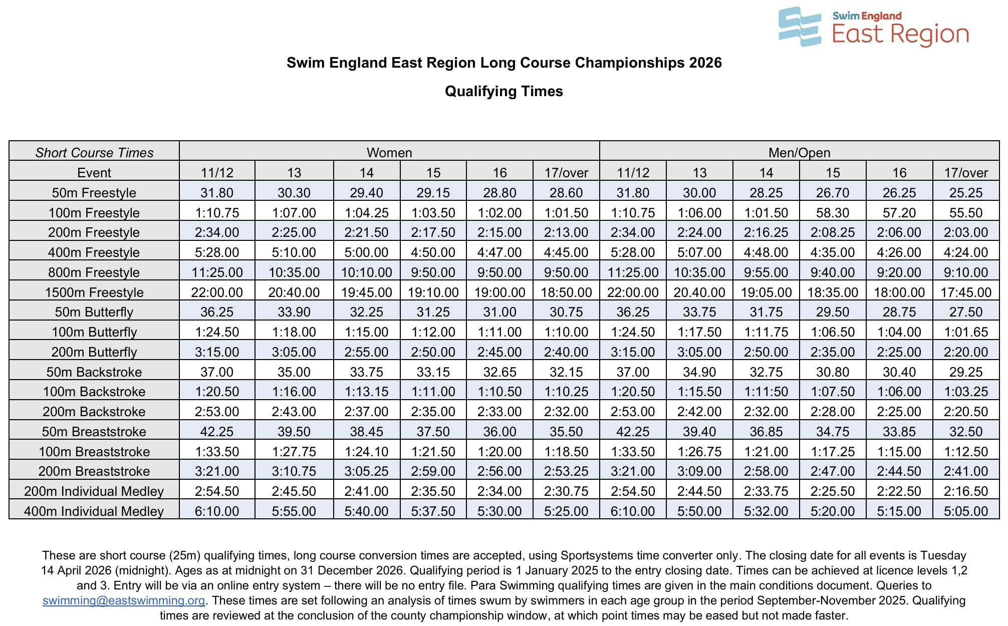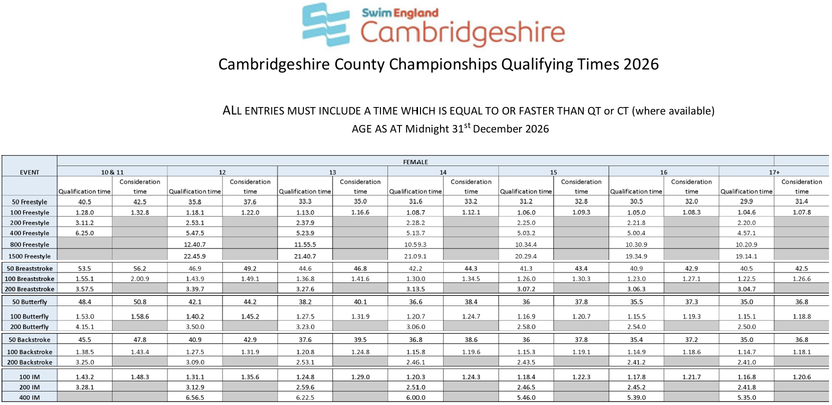 These are the Swim England Cambridgeshire qualifying times, which also include the consideration times.